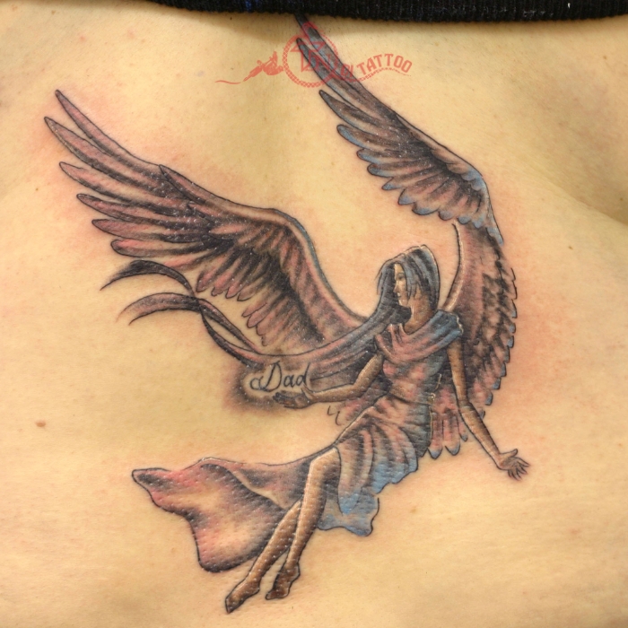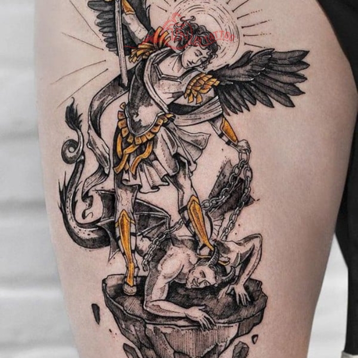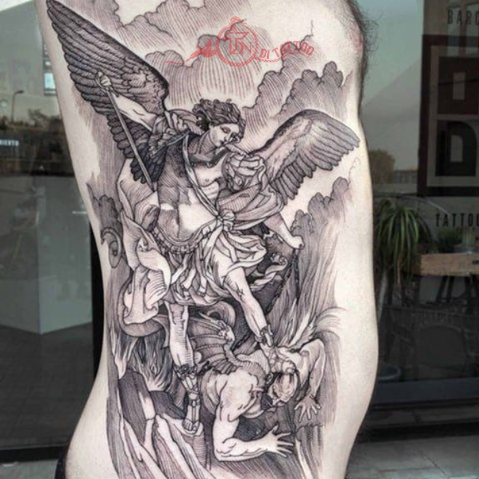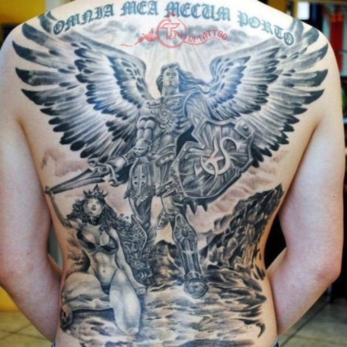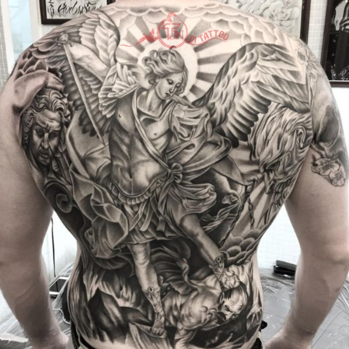 Trong nghệ thuật xăm, thiên thần thường được xem là biểu tượng của sự trong sáng, lòng nhân từ, và sức mạnh bảo hộ. Người mang hình xăm này như gửi gắm niềm tin rằng bản thân luôn được dẫn lối, che chở vượt qua thử thách.